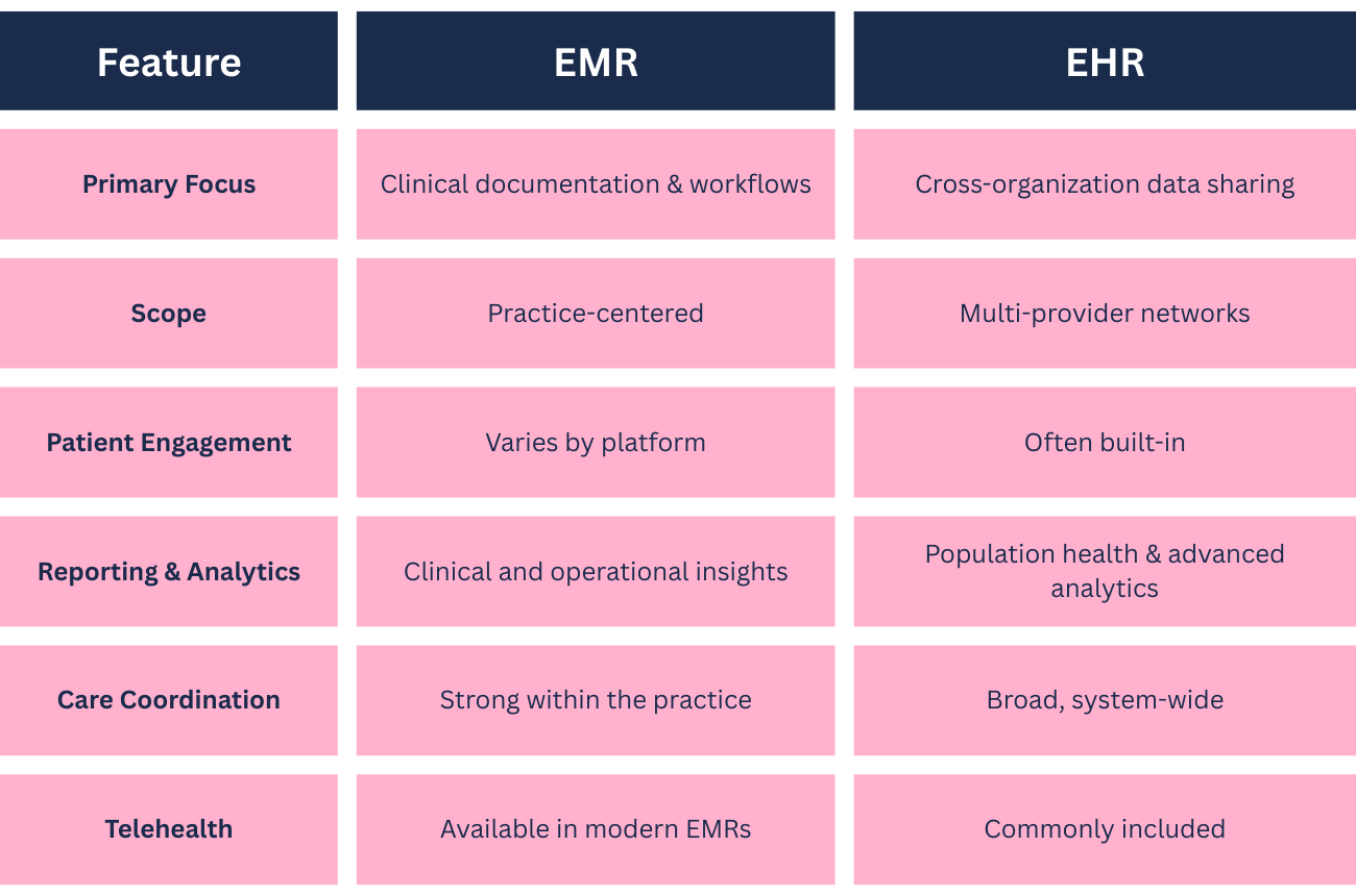 In short, EMRs excel at powering clinical care inside a practice, while EHRs emphasize broader interoperability. Today’s most effective platforms combine these strengths rather than forcing practices to choose one or the other.